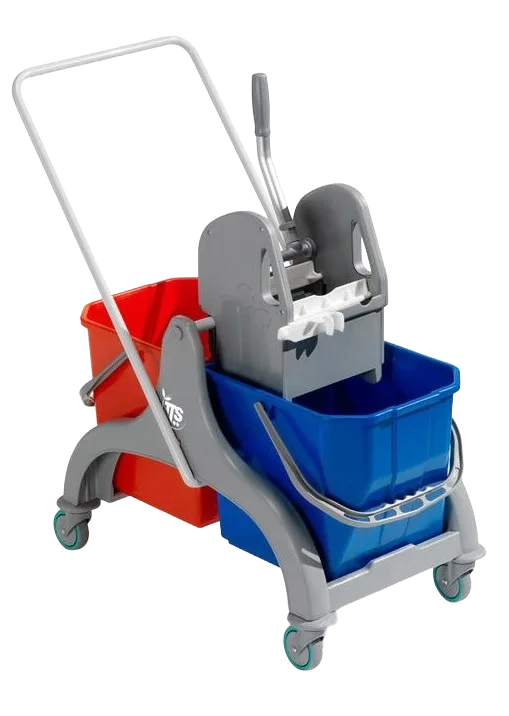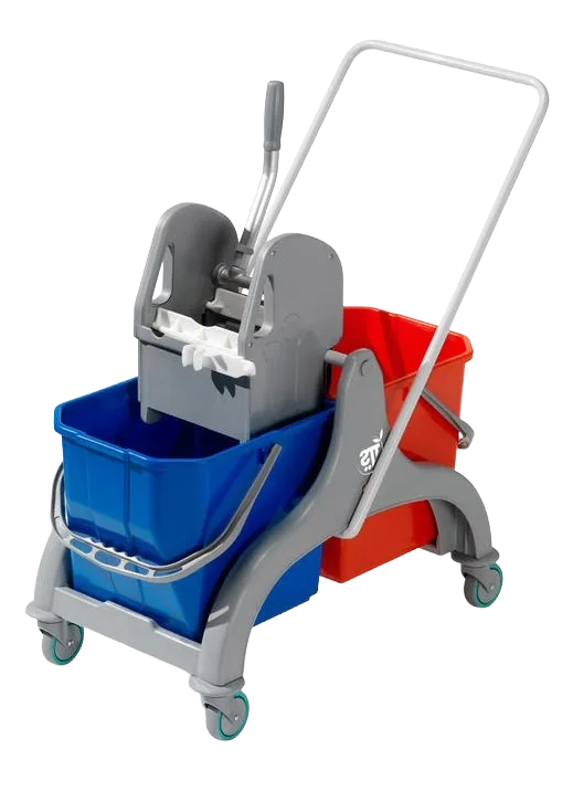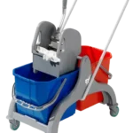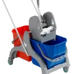 Carro de limpeza com dois baldes e prensa.